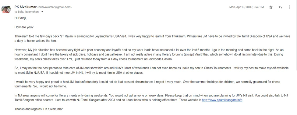 2015 அன்று பாஸ்டன் பாலாஜிக்கு நான் எழுதிய மின்மடலில் இருந்து சில வாசகங்கள்: “2. Recently, when we arranged for NJTS meet for Jeyamohan